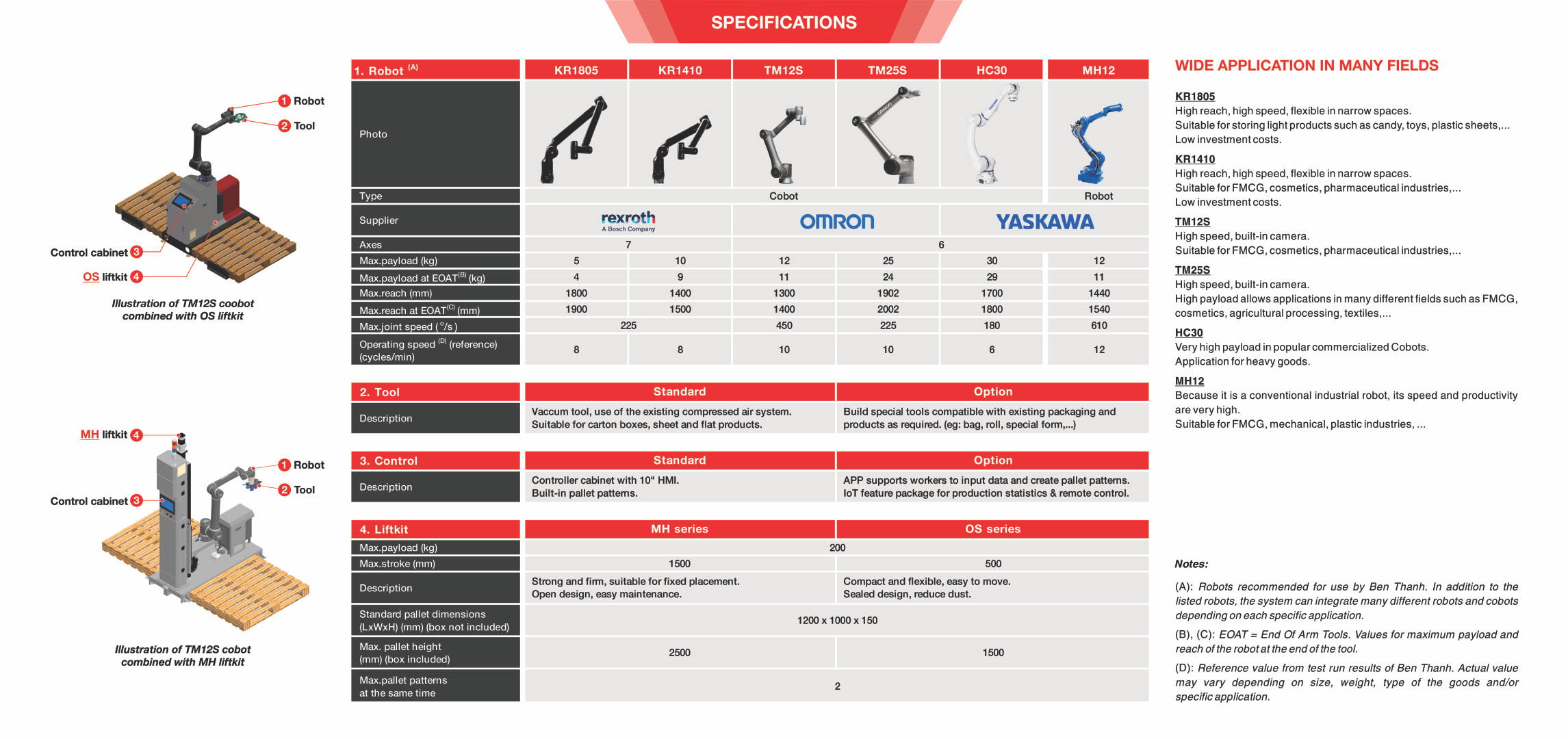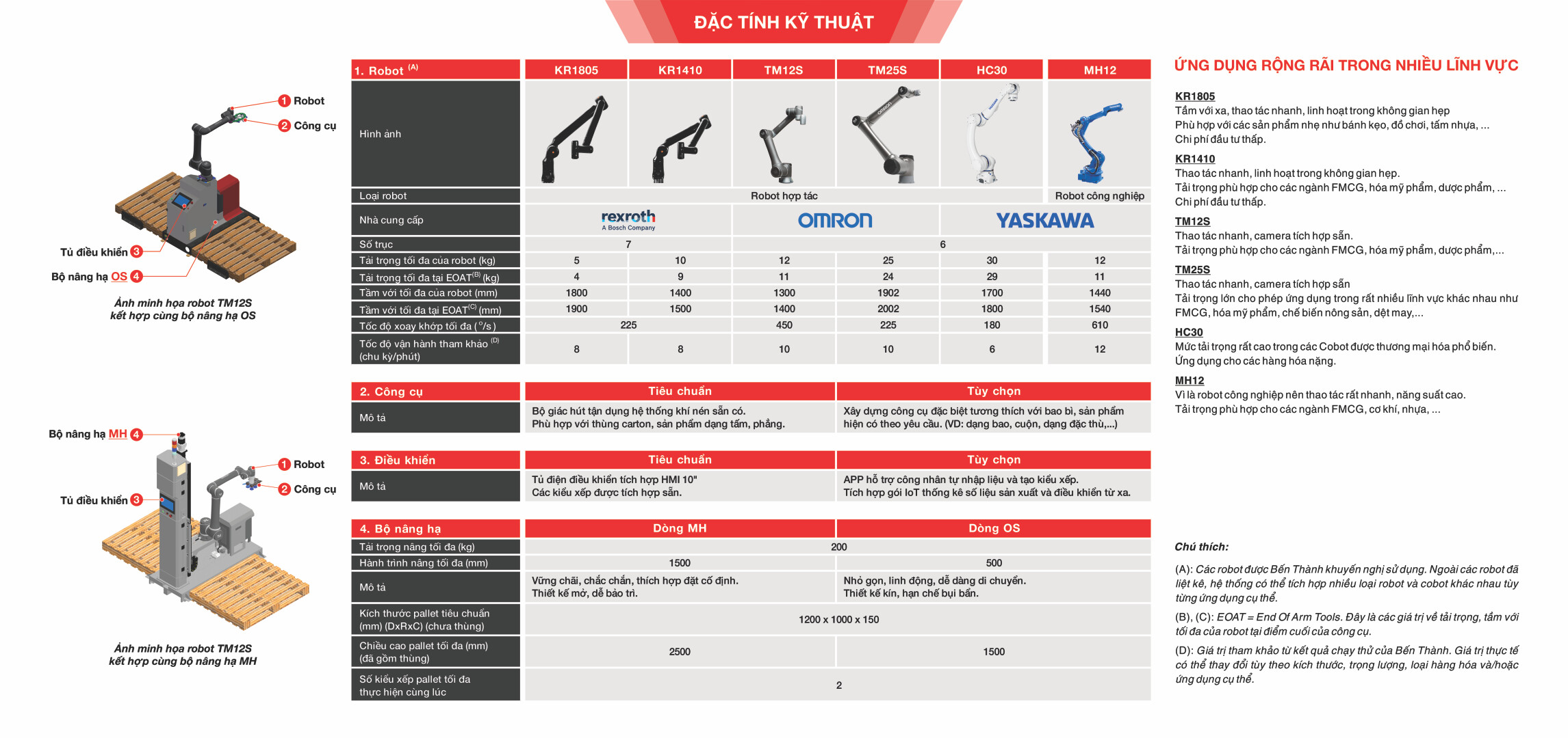 (*) Các giá trị có thể thay đổi tùy theo yêu cầu của khách hàng về ứng dụng cụ thể hoặc bộ nâng hạ hoặc loại robot được dùng để tích hợp.