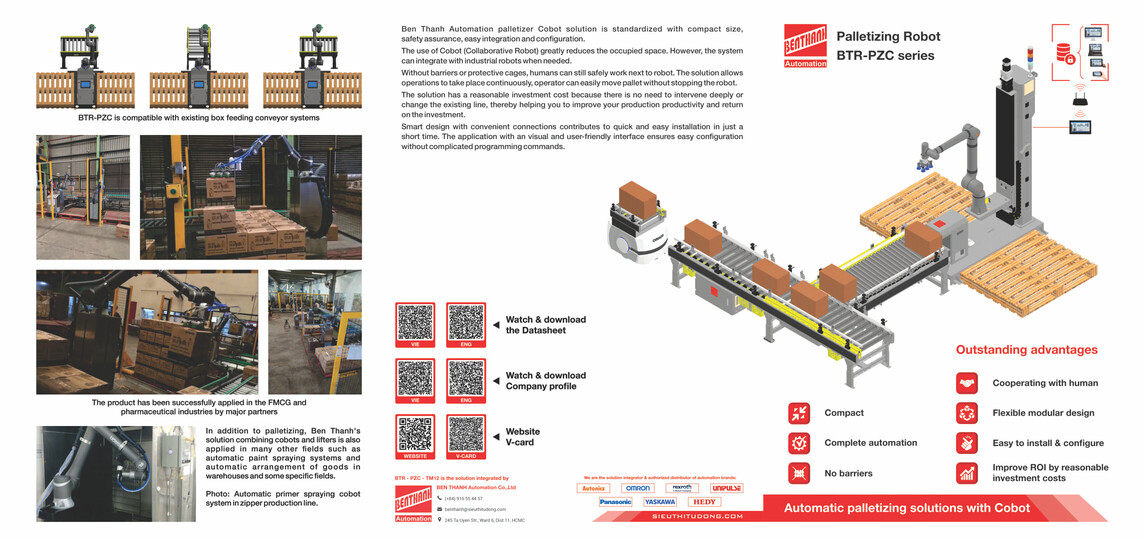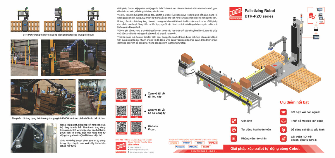 Do đó Bến Thành cho ra đời dòng sản phẩm BTR-PZC là sự kết hợp của Bộ nâng hạ cùng Cánh tay robot, đặc biệt ưu tiên sử dụng Robot hợp tác (còn gọi là Cobot). Hệ thống giúp công việc xếp pallet hiệu quả hơn trong khi robot vẫn làm việc bênh cạnh các công nhân.
