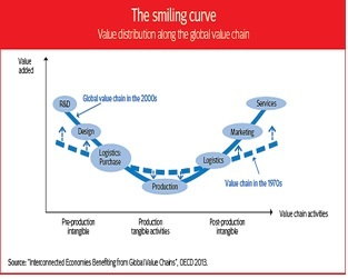 Chiến lược chung của các tập đoàn đa quốc gia là tập trung vào những khâu tạo ra giá trị gia tăng cao, bao gồm: nghiên cứu và phát triển (R&D), thiết kế, xây dựng thương hiệu, marketing, phân phối và dịch vụ hậu mãi. Những khâu có giá trị gia tăng thấp hơn, chẳng hạn như lắp ráp và sản xuất, thường được chuyển sang các quốc gia đang phát triển để tận dụng ưu thế về lao động giá rẻ và chính sách ưu đãi về thuế, đất đai.