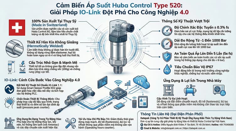 Tổng quan tính năng cảm biến áp suất dòng 520 với ngõ ra IO-Link của Huba Control